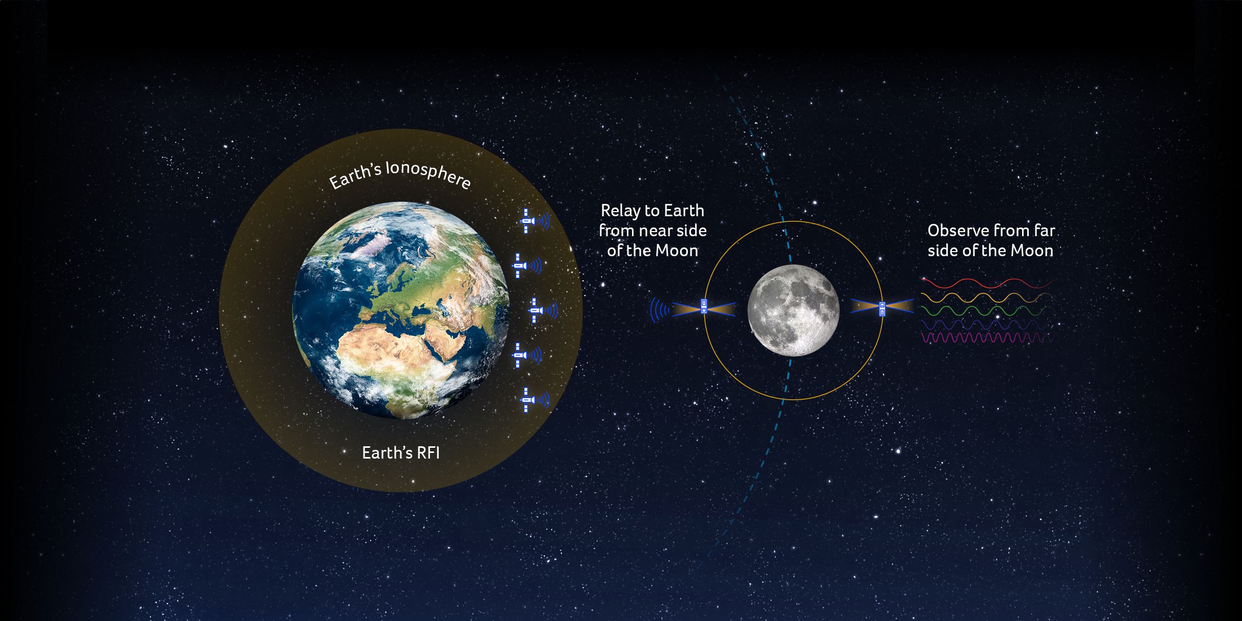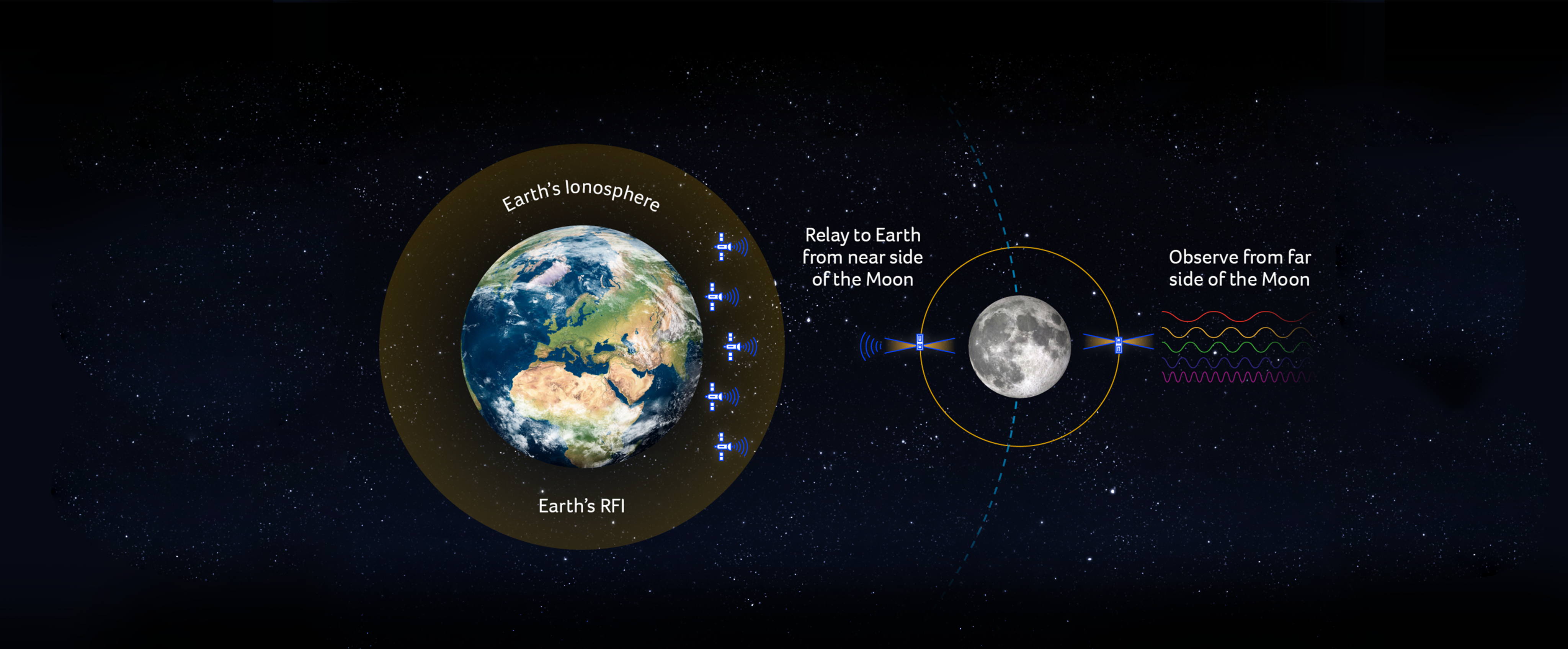 The far side of the Moon is a naturally radio-silent zone in the inner Solar System. There, the lunar body itself blocks Earth’s transmissions, creating an occultation where cosmic signals can be heard unspoiled. CosmoCube will orbit this region, spending long stretches of time within the Moon’s radio shadow to observe the untouched radio Universe.